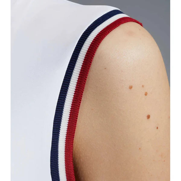 A decorative curve stand collar is finished with a 1/4 zip, allowing for easy closure. PE brand colour stripes trim the front and sleeve edge for a sporty touch.