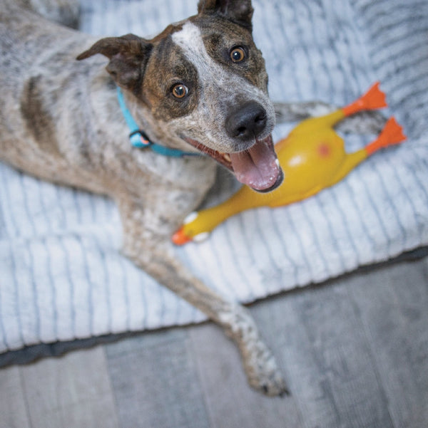 This 100% natural latex duck is designed to keep your dog entertained, active and engaged. The tough-chew toy alleviates boredom and reduces stress for anxious dogs as well as providing a fun outlet for energetic dogs. It squeaks on pressure, so will trigger their natural instincts to hunt, explore and play.