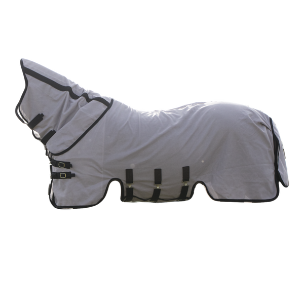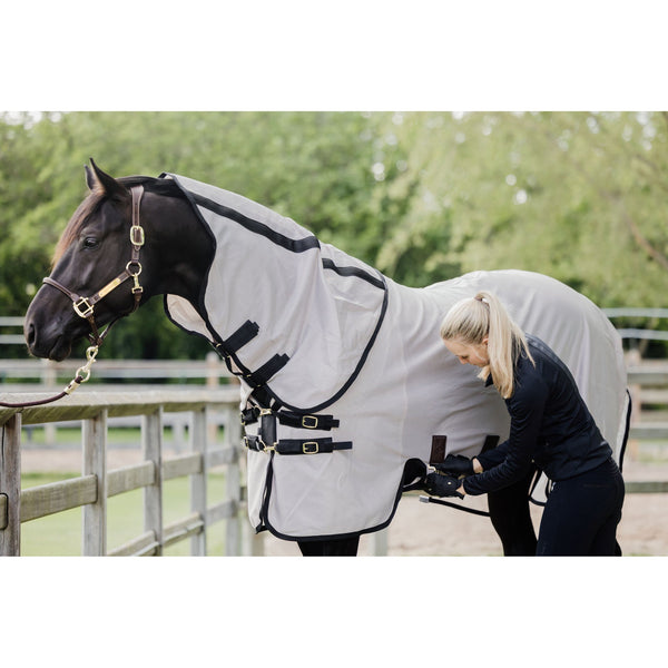 The fly rug is made from a dense structured mesh fabric, which keeps most bugs off. The mesh is extremely strong and will be an ideal field companion for many summers. The fabric is flat on the inside, this has a soft feeling and makes sure that no hairs will stick to the rug. Thanks to the light color of the rug, it will reflect the sunrays and does not absorb heat. The fine mesh still allows air permeability. The mane, chest and tail area are lined with a smooth polyester to avoid rubbing.