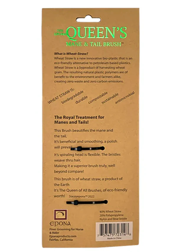 The Queen's Brush is our most sought after grooming brush! Consistently a 5-star reviewed mane & tail brush you definitely need in your grooming kit! The Queen's Brush is Epona's boar-hair and nylon bristle brush that untangles, polishes, and smooths through manes and tails. Β It's flexible spiral paddle is engineered so it can't possibly yank or rip out hair. Β It's eco-friendly bio-plastic wheat straw base is highly durable, lightweight, and biodegradable.